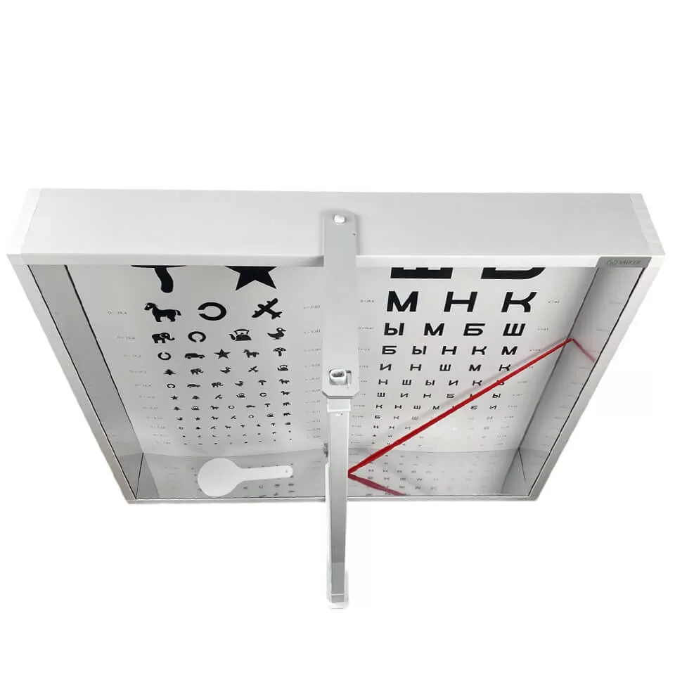 Осветитель таблиц российского производства выполнен в лёгком пластиковом корпусе, внутренний периметр которого снабжен зеркальными отражателями. На задней стенке корпуса закрепляются таблицы для проверки остроты зрения.