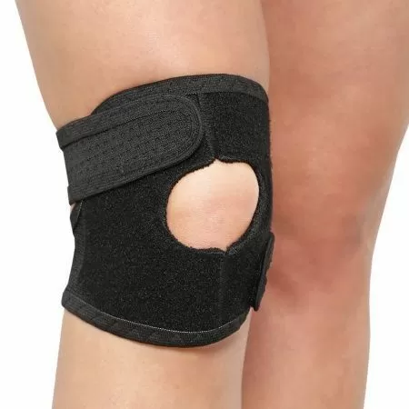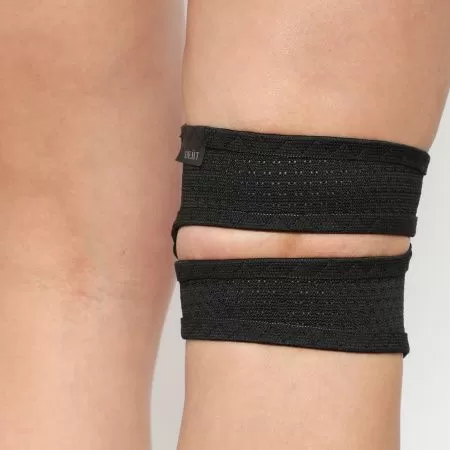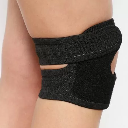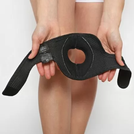 - Расположите бандаж на ноге так, чтобы пателлярное кольцо находилось посредине коленной чашечки