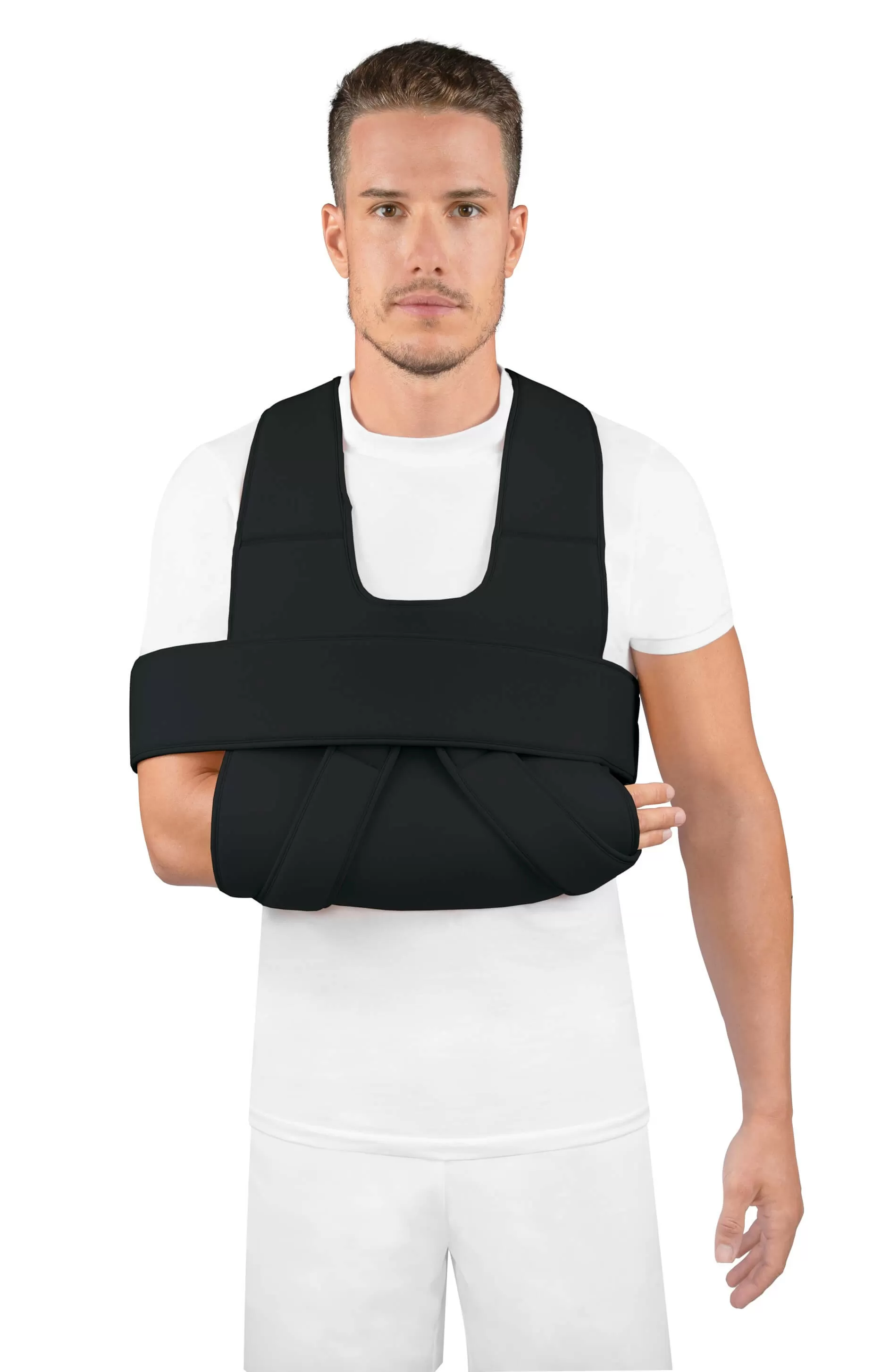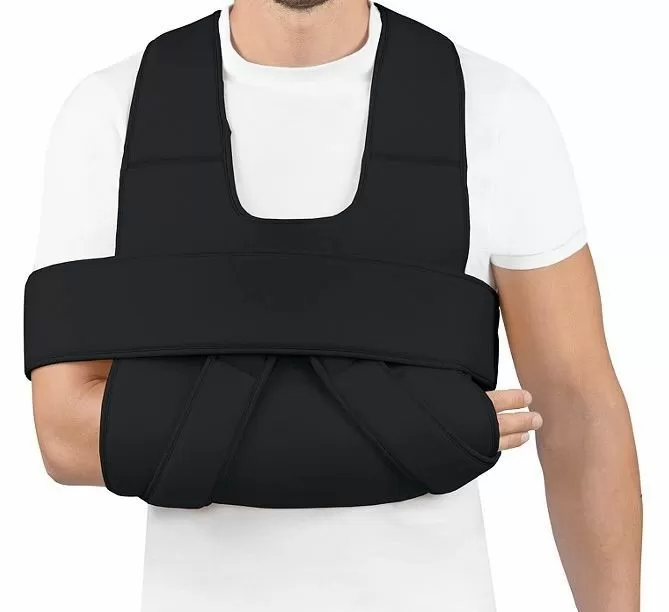 - Оказывает поддержку руки с фиксацией к туловищу.