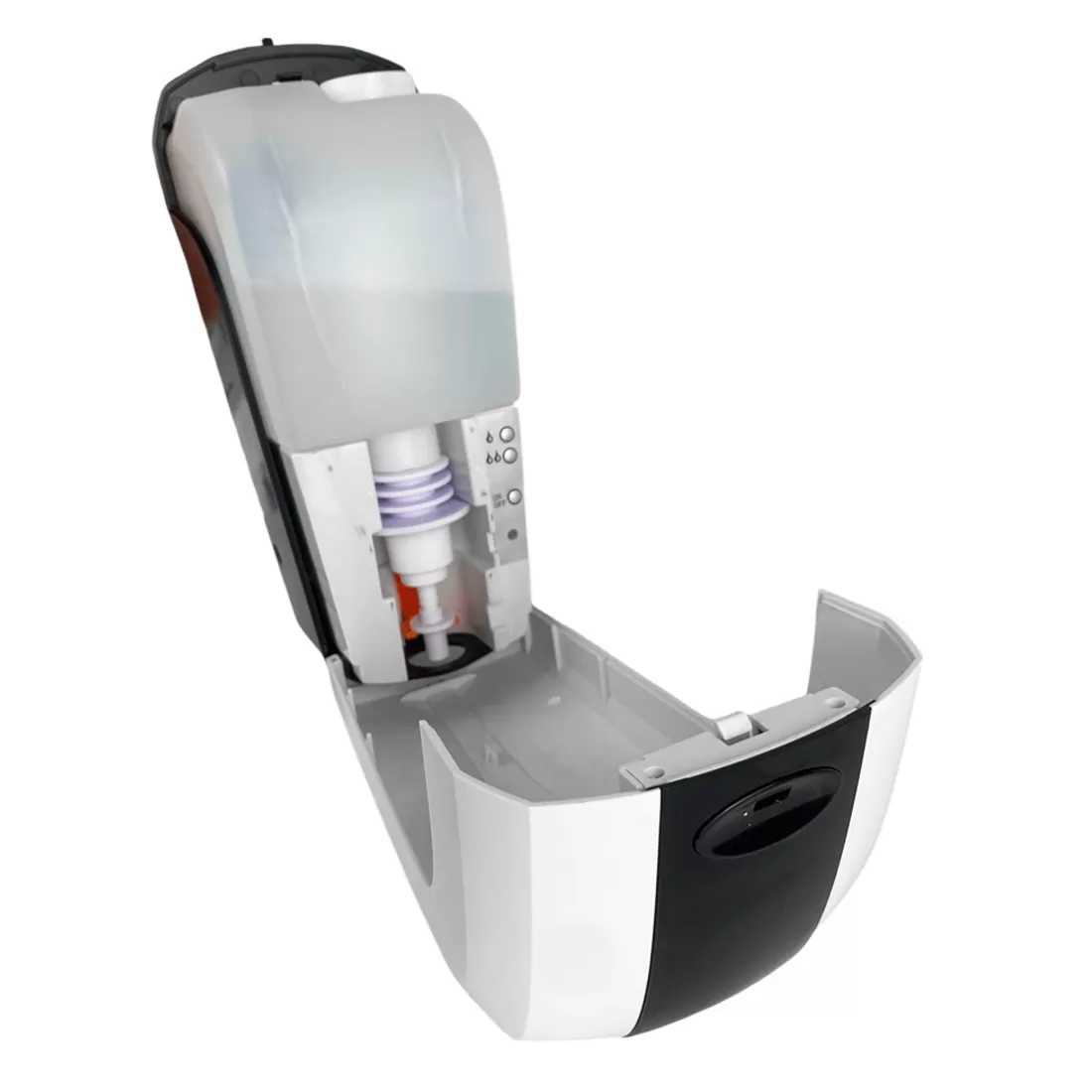 Оснащён встроенной ёмкостью на 1 литр с возможностью дозаправки, что позволяет избежать использования дорогостоящих расходных материалов в фасовке по 1 литру (как у локтевых дозаторов) и допускает дозаправку из более экономичных канистр на 5 литров.