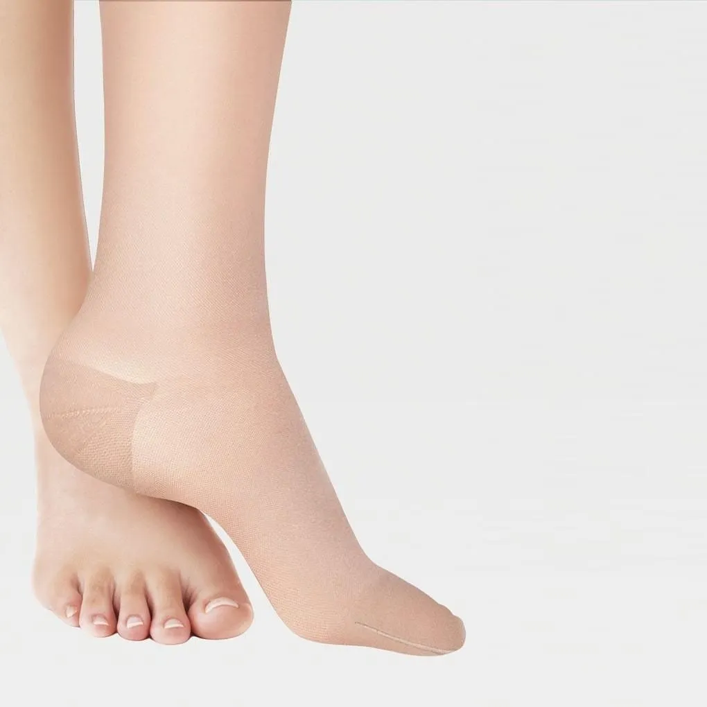 - Возьмите верх изделия рукой и, выворачивая, стяните вниз до колена, затем до лодыжки и до носка.