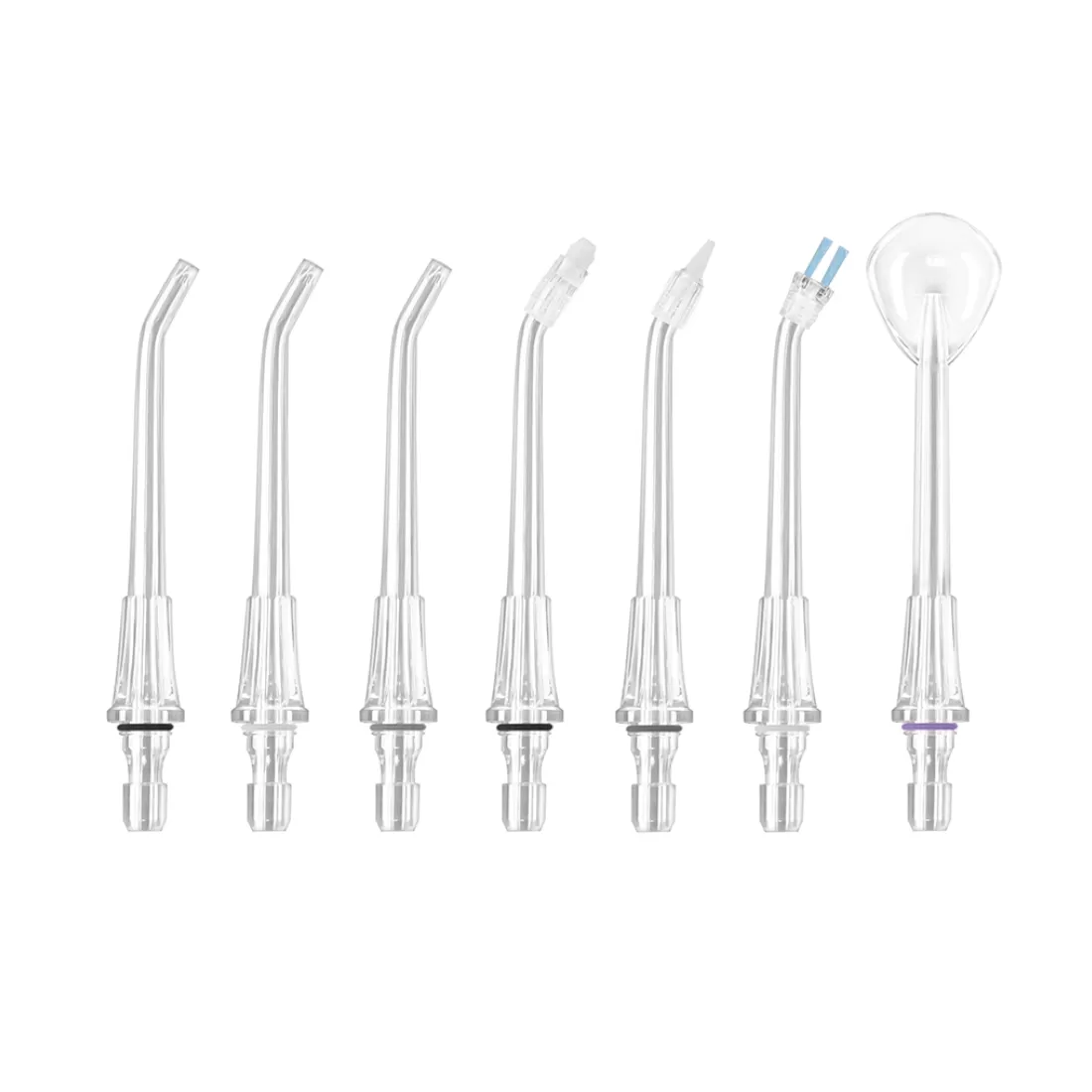 - 7 насадок в комплекте. Стандартные насадки (3 шт.), ортодонтальная для брекетов (1 шт.), пародонтальная с мягким наконечником (1 шт.), насадка для чистки языка (1 шт.) и насадка-щетка для чистки зубов с использованием зубной пасты (1 шт.)