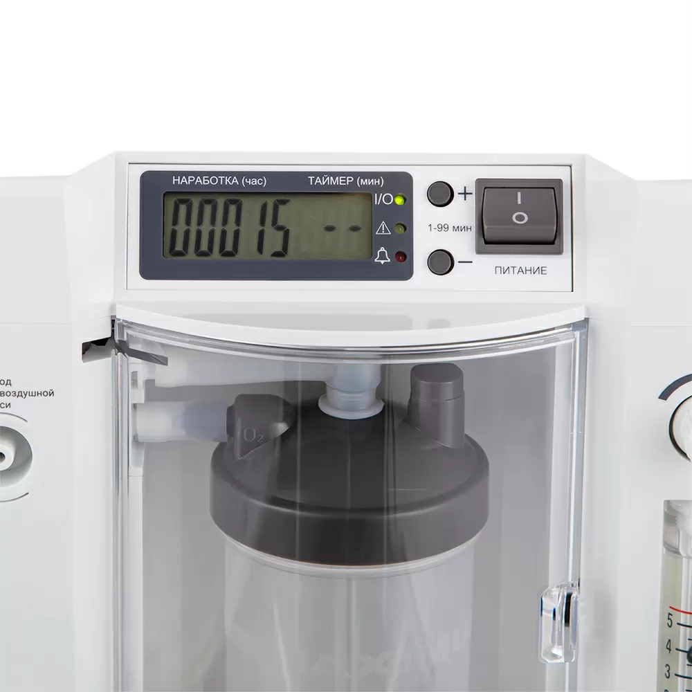 - Управление кислородным концентратором осуществляется с помощью интуитивно понятной панели с дисплеем, на котором отображаются настройки рабочего таймера. Имеется световая индикация ошибок.