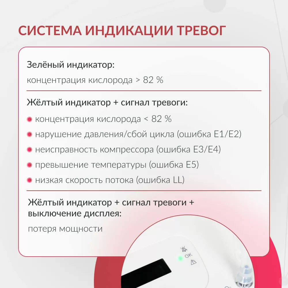 - Безопасность. Концентратор кислорода максимально безопасен для пользователей. В конструкции нет кислородных баллонов, а функция оповещения своевременно сигнализирует о таких неполадках, как падение давления, неисправность компрессора, низкая концентрация кислорода и проч. Такая система позволяет пользователю быстро понять, в чём заключается проблема, и решить её самостоятельно. Функция аварийного отключения предохраняет прибор от скачков напряжения и перегрузок.