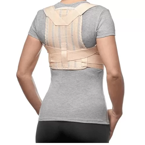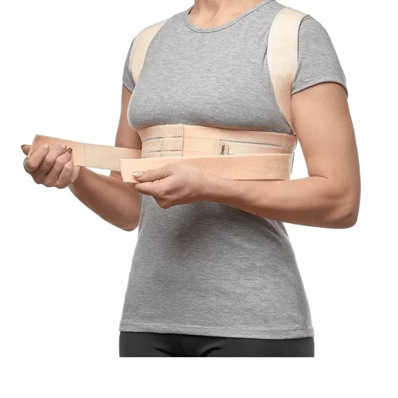- Корректор осанки с нерастяжимыми лямками в мягких чехлах, фиксирующихся застежкой, с четырьмя металлическими ребрами жесткости и эластичным поясом на застежке.