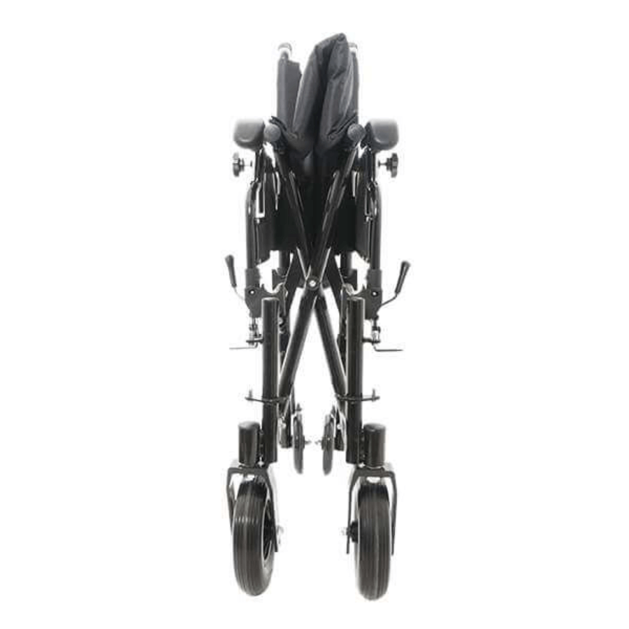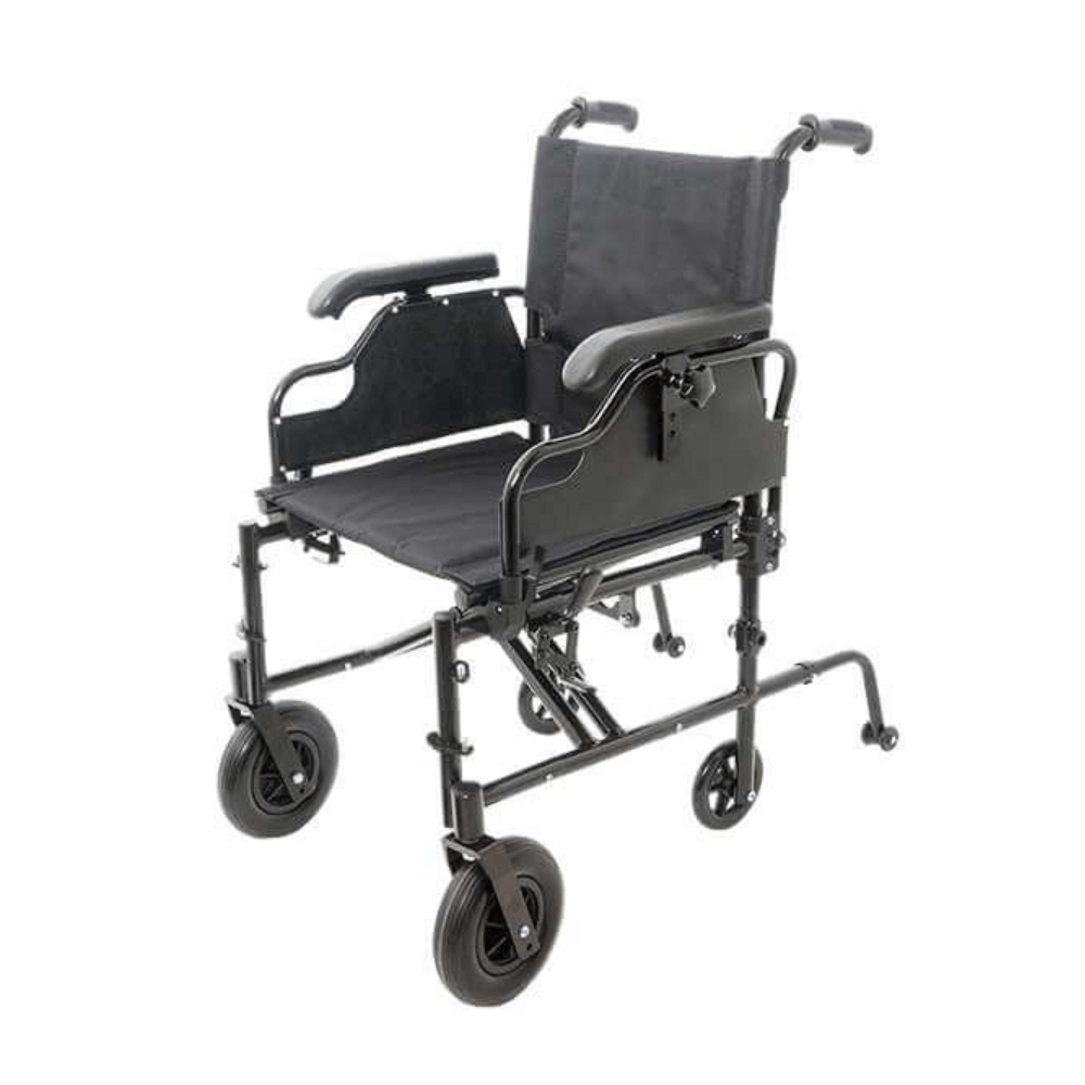 Складная алюминиевая коляска с фиксированной спинкой, откидными подлокотниками и подножками. Оснащена трансферными колесами и съемным антиопрокидывателем, обеспечивающим дополнительную безопасность пользователю при переезде неровностей и препятствий.Материал обивки сиденья и спинки – прочный, долговечный и практичный нейлон. Трансферные колеса позволяют проходить даже в самые узкие проемы с помощью сопровождающего лица.