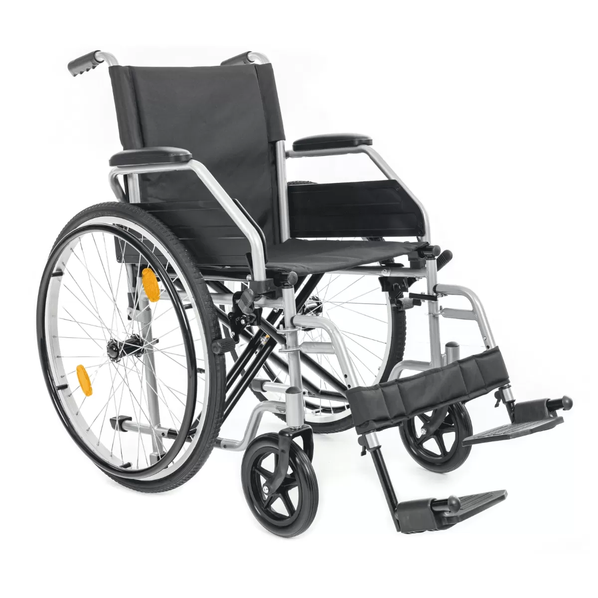 Съемные антиопрокидыватели делают езду в гору безопасной. Коляска снабжена откидными подножками и стояночным тормозом, что делает пересаживание человека из коляски и в неё более безопасным и удобным.