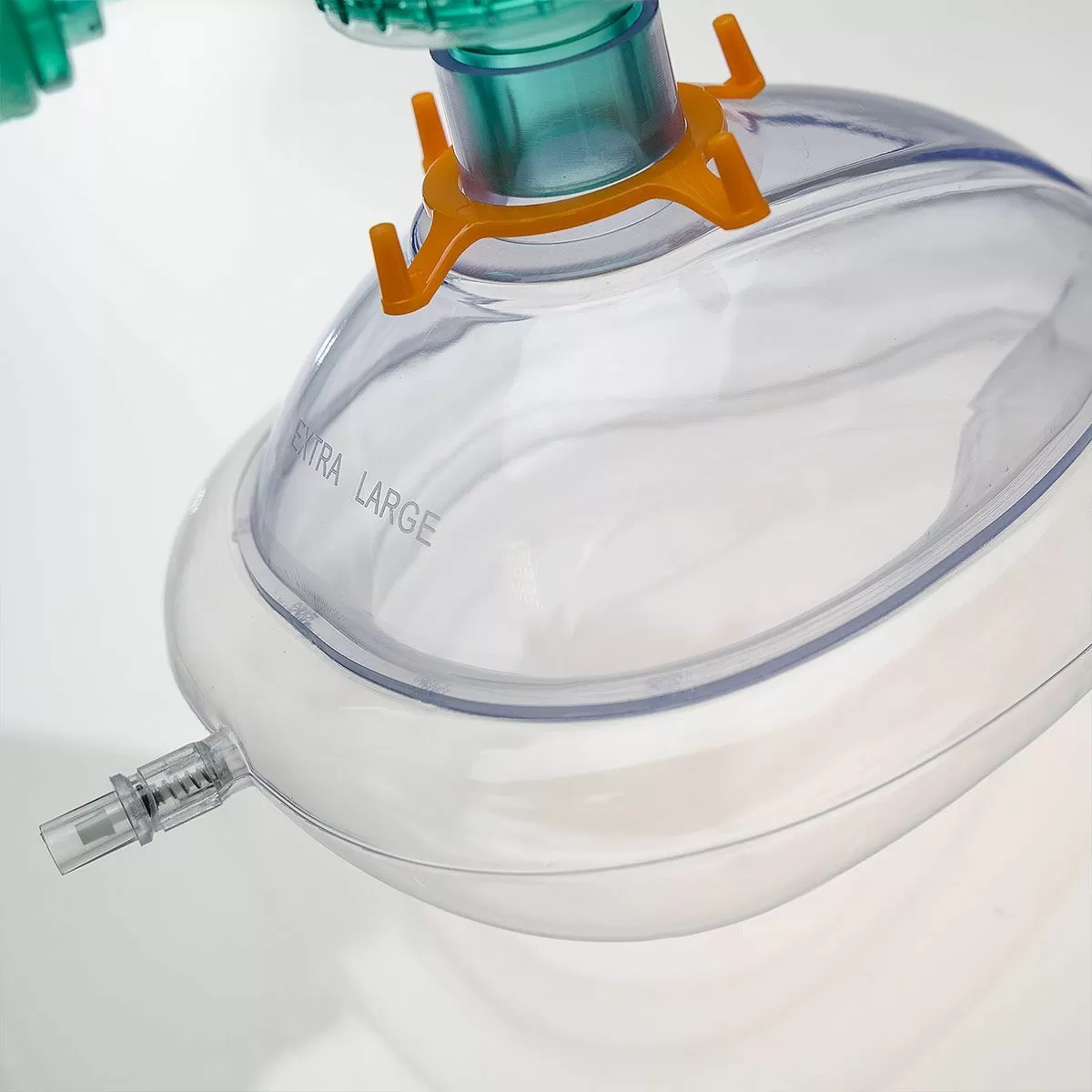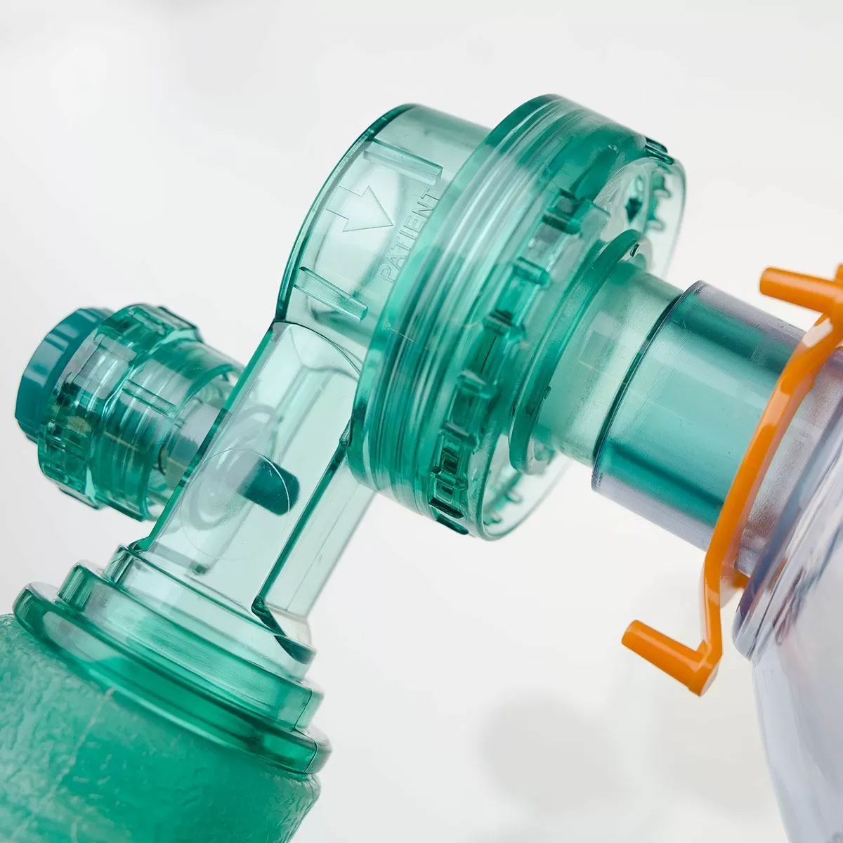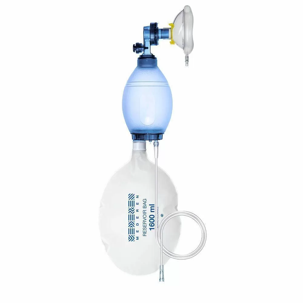 - Cостоит из одноразового ПВХ мешка и одноразовой прозрачной дыхательной маски, снабженной раздувной манжетой с разъемом Луер и съемным кольцом для фиксации на голове пациента с цветовой маркировкой соединенных с помощью вертлужного коннектора (ось вращения 360˚) с клапаном пациента типа «Утконос» объемом 7 мл, разделяющим воздушные потоки, и клапаном ограничения давления: 40 см Н2О (педиатрические) / 60 см Н2О (взрослые), для предупреждения баротравмы легких.