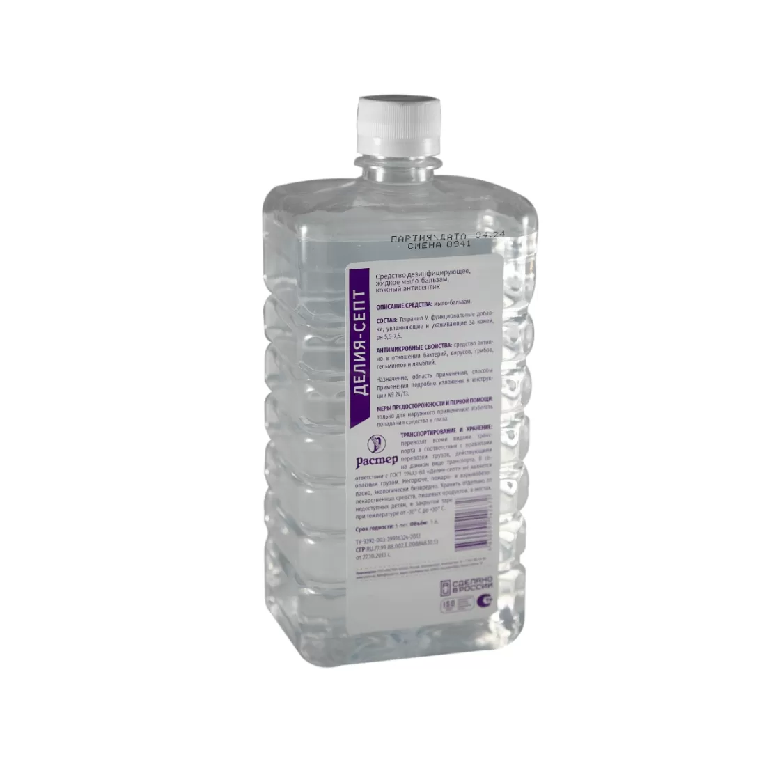 - Химический состав дезсредства Делия-септ: Поверхностно-активные вещества (ПАВ), Вспомогательные компоненты.