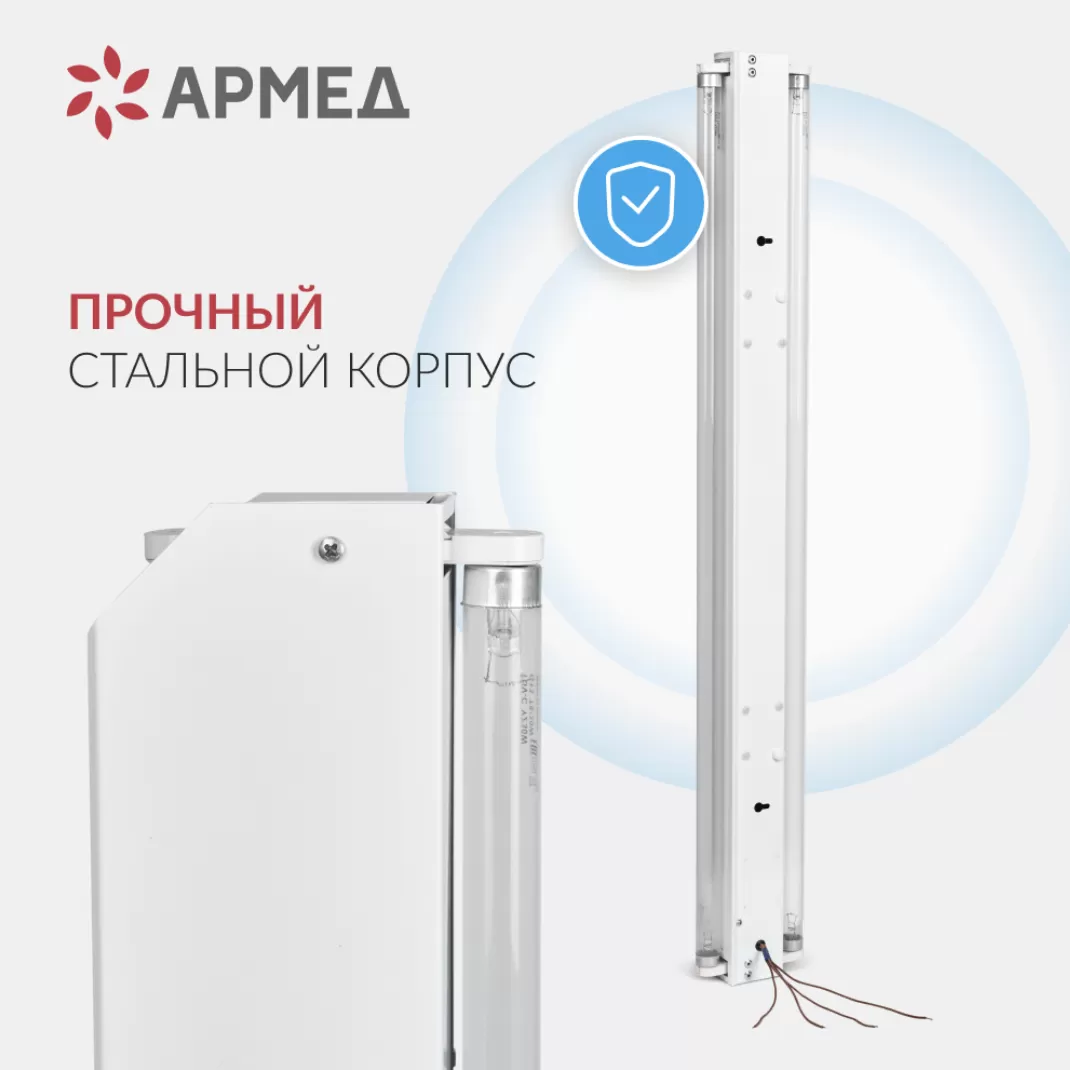 - Безопасность. Наружные поверхности облучателя выполнены из химически стойких материалов, не реагирующих на УФ-излучение. Корпус, крышка и кронштейн сделаны из стали.