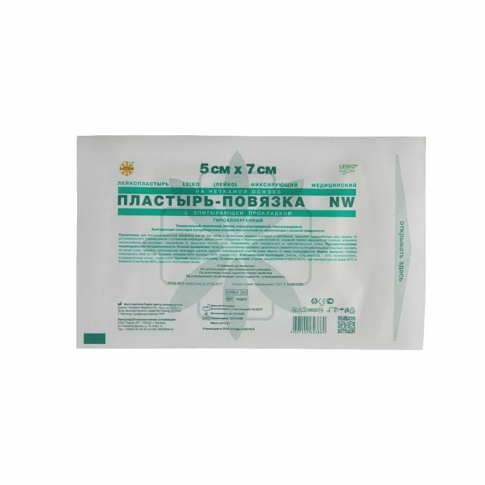 Лейкопластырь LEIKO (ЛЕЙКО) фиксирующий медицинский на нетканой основе, пластырь-повязка NW водонепроницаемый, с впитывающей прокладкой, гипоаллергенный.