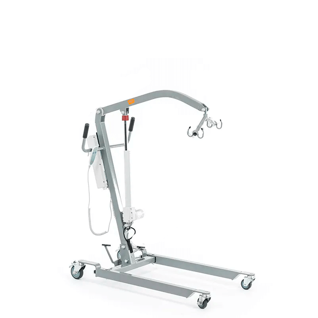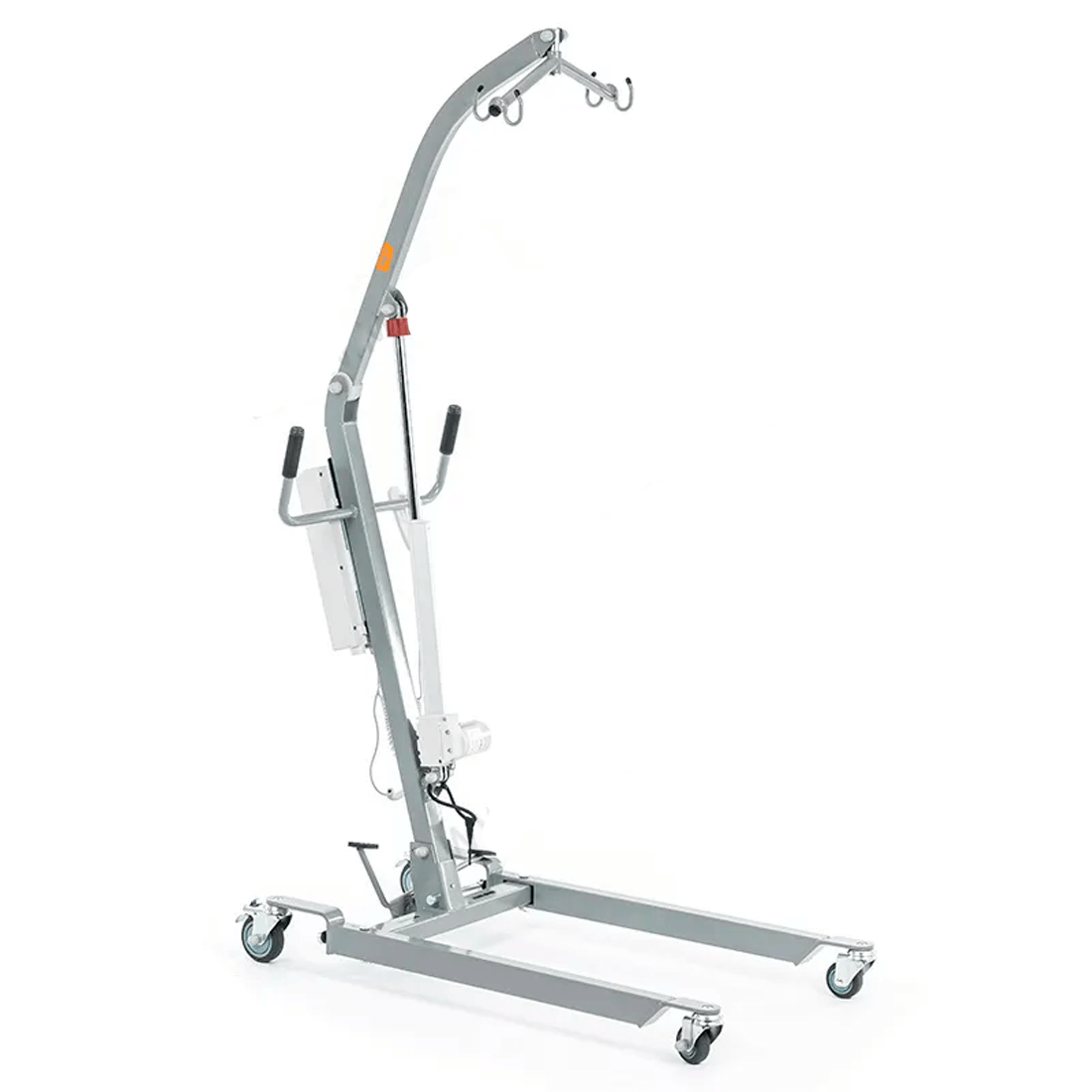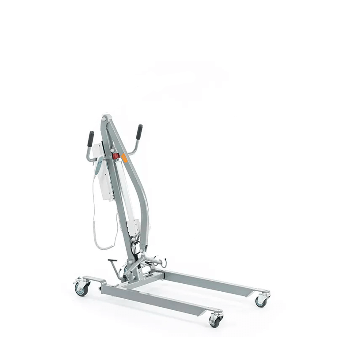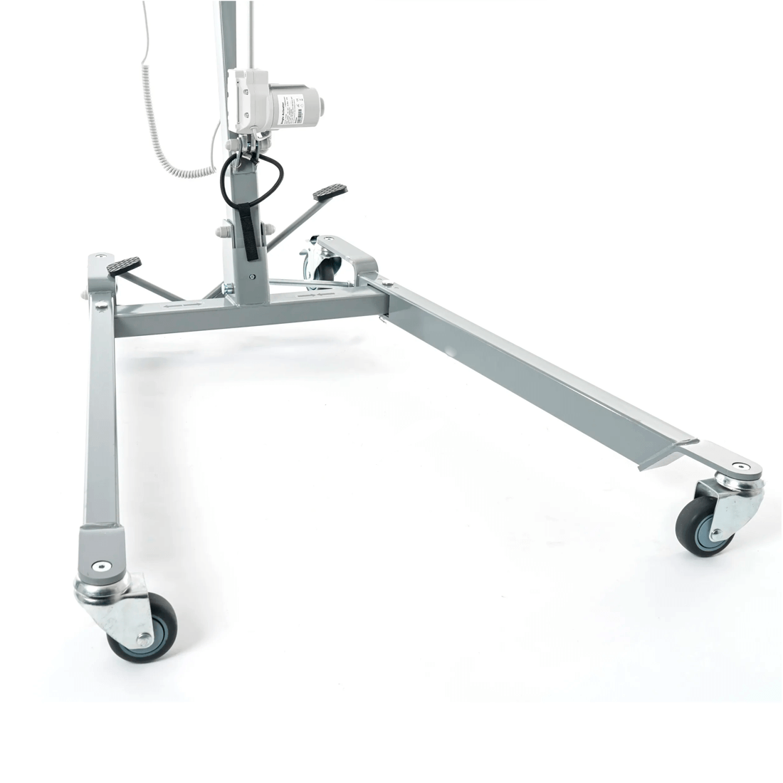 Электрический прикроватный подъёмник, выполненный на металлической раме, складывающейся для удобства хранения и транспортировки. Раздвижные передние колёсные опоры высотой всего 115 мм для максимальной устойчивости и возможности заезда под низкую мебель.