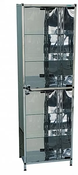 - Имеет два отделения, каждое из которых оборудовано двумя стеклянными полками, двумя дверками, укомплектовано замком. Установлен на винтовые, регулируемые опоры.