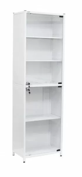 - Шкаф имеет два отделения, каждое из которых имеет стеклянную дверь с замком, в верхнем две металлические полки, в нижнем одна.