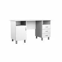 - Стол имеет две тумбы: одна — с нишей и 3-мя выдвижными ящиками на роликовых направляющих, другая — с нишей и отделением с дверкой и полкой