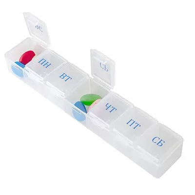 Для таблетированной продукции на семь дней, состоит из 7-ми отделений, которые соответствуют дням недели и режиму приема таблетированной продукции.