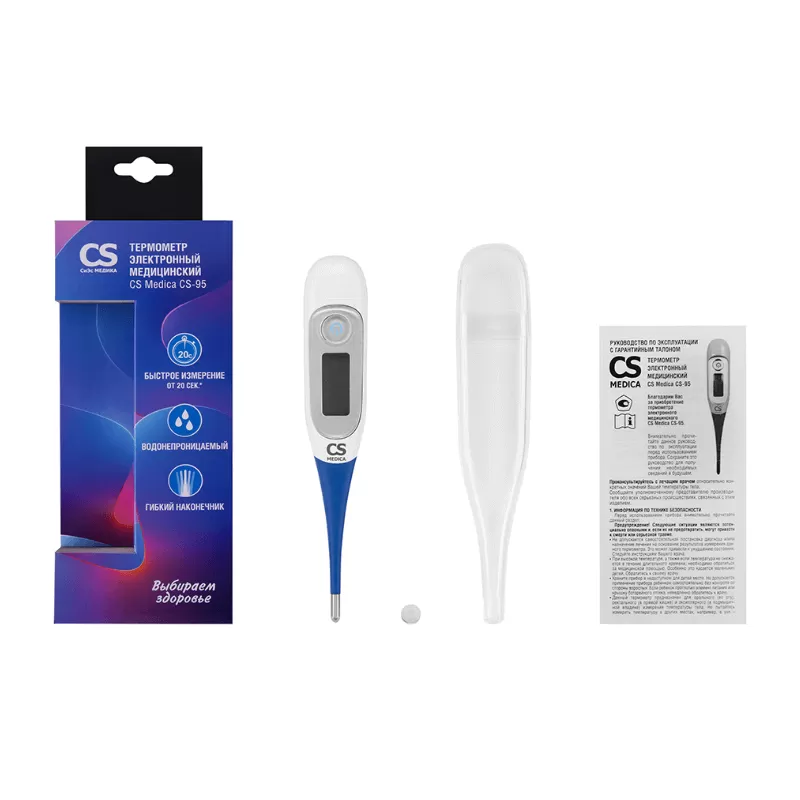 Электронный термометр CS Medica CS-95 - высокоточный прибор с большим дисплеем и мягким наконечником для измерения тела ректальным, аксиллярным и оральным способами взрослым и детям. Термометр относится к категории оборудования домашнего назначения."Тревожная сигнализация" - при температуре свыше 37,8 °C прибор издает звук, который оповещает о повышенной температуре.