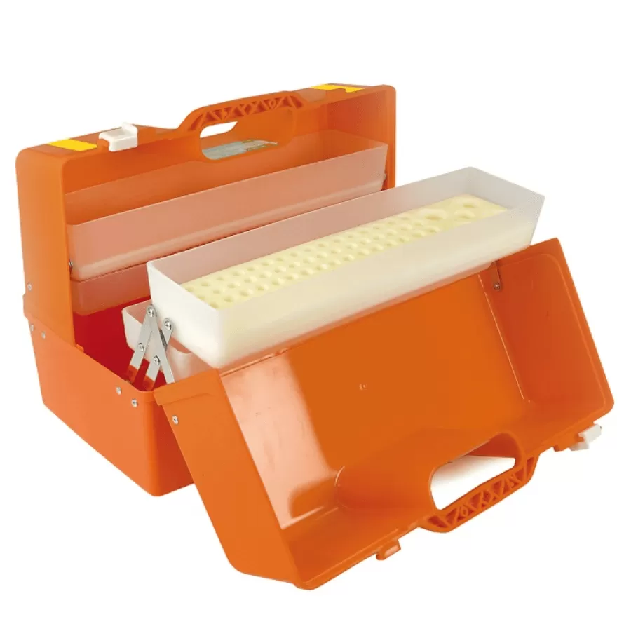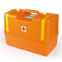 Укладка медицинская представляет собой пластиковый саквояж из высокопрочного холодо- и теплостойкого пластика. Чемодан скорой помощи оранжевого цвета, имеет удобные, вандалопрочные ручку и замки, исключающие его открытие при транспортировке. Дно укладки скорой помощи прочное, износостойкое. Верхняя часть футляра выполнена в виде створок, открывающихся в стороны, в створках установлены лотки с ложементом для ампул и флаконов антисептиков. Створки крепятся к дну надёжными петлями со стальным стержнем внутри. При открытии медицинского ящика обеспечена постоянная вертикальная ориентация лотков и удобный доступ к содержимому лотков и дна футляра. Открытая медицинская укладка, по существу, является комфортным, рабочим местом. Ложемент обеспечивает полный набор мест для ампул, ампулы ориентированы вертикально, не «звенят» и не бьются. На верхней поверхности медицинской укладки имеется бирочное окошко для обозначения номера бригады или названия набора. Незаменима для муниципальных линейных бригад СМП с большой интенсивностью вызовов.